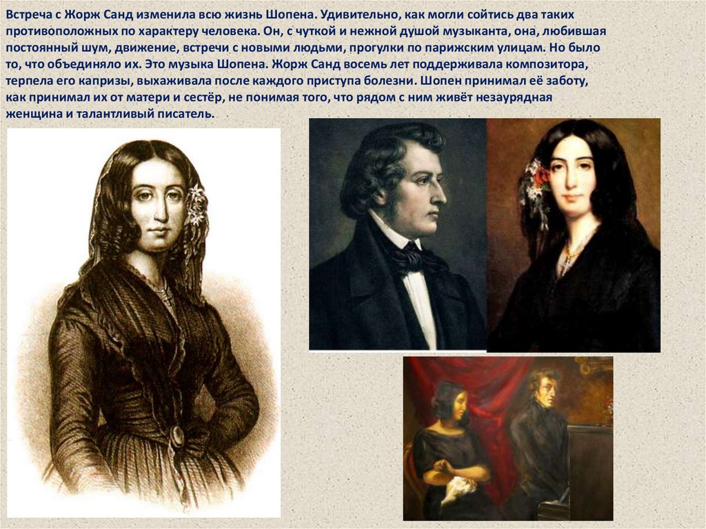 Встреча с Жорж Санд изменила всю жизнь Шопена. Удивительно, как могли сойтись два такихпротивоположных по характеру человека. Он, с чуткой и нежной душой музыканта, она, любившая