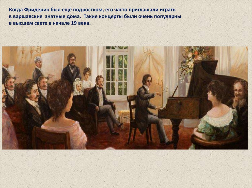 Когда Фридерик был ещё подростком, его часто приглашали игратьв варшавские знатные дома. Такие концерты были очень популярны