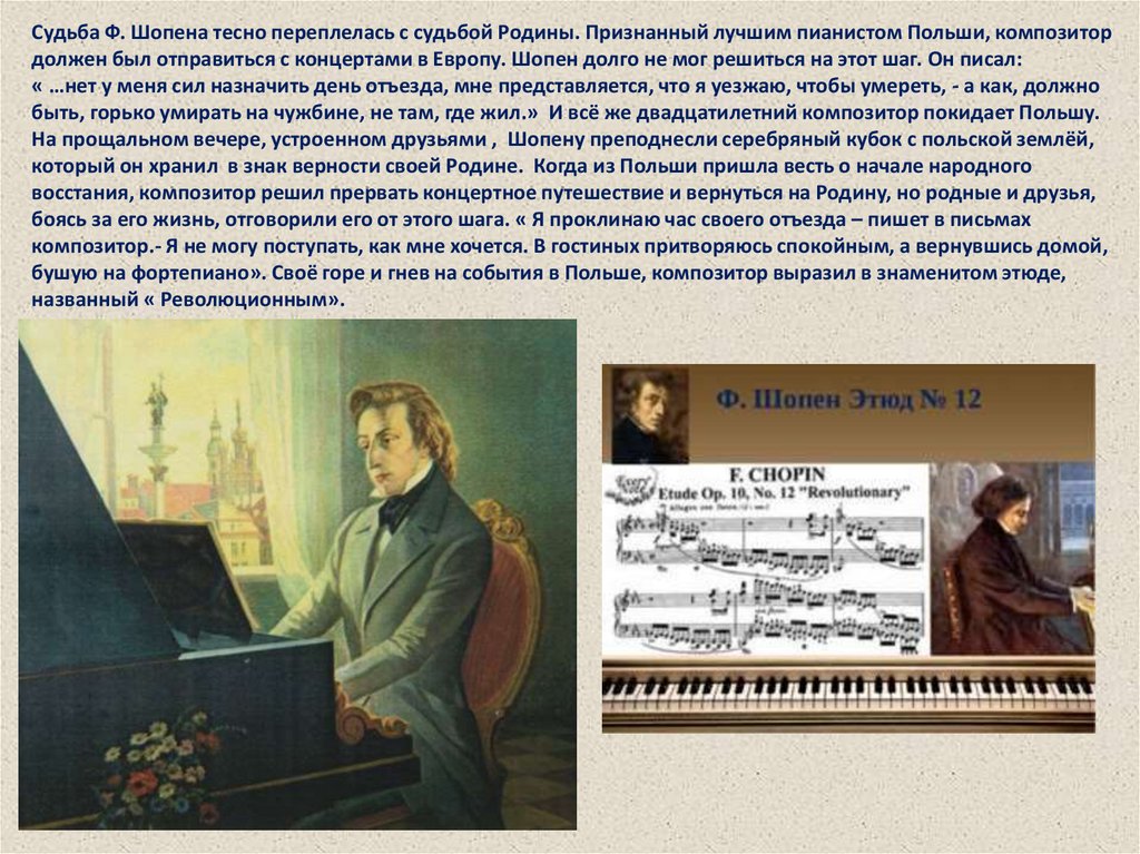 Судьба Ф. Шопена тесно переплелась с судьбой Родины. Признанный лучшим пианистом Польши, композитордолжен был отправиться с концертами в Европу. Шопен долго не мог решиться на этот шаг. Он писал: