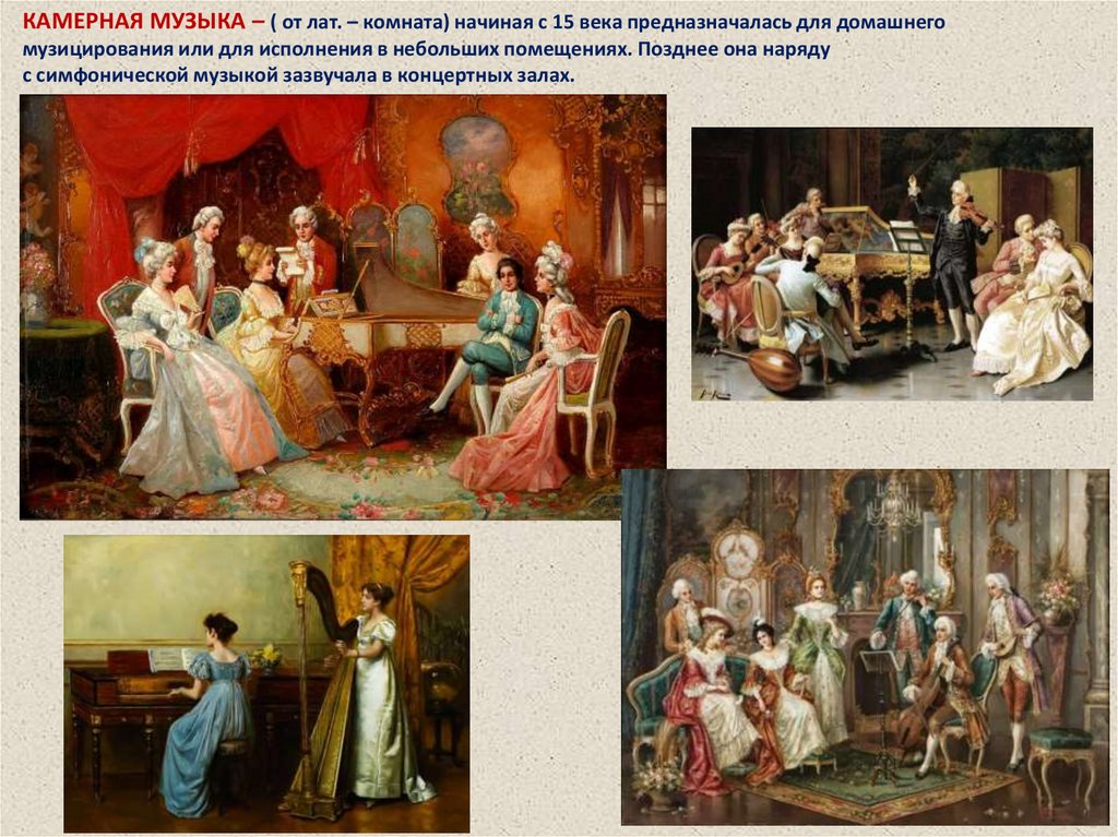 КАМЕРНАЯ МУЗЫКА – ( от лат. – комната) начиная с 15 века предназначалась для домашнегомузицирования или для исполнения в небольших помещениях. Позднее она наряду