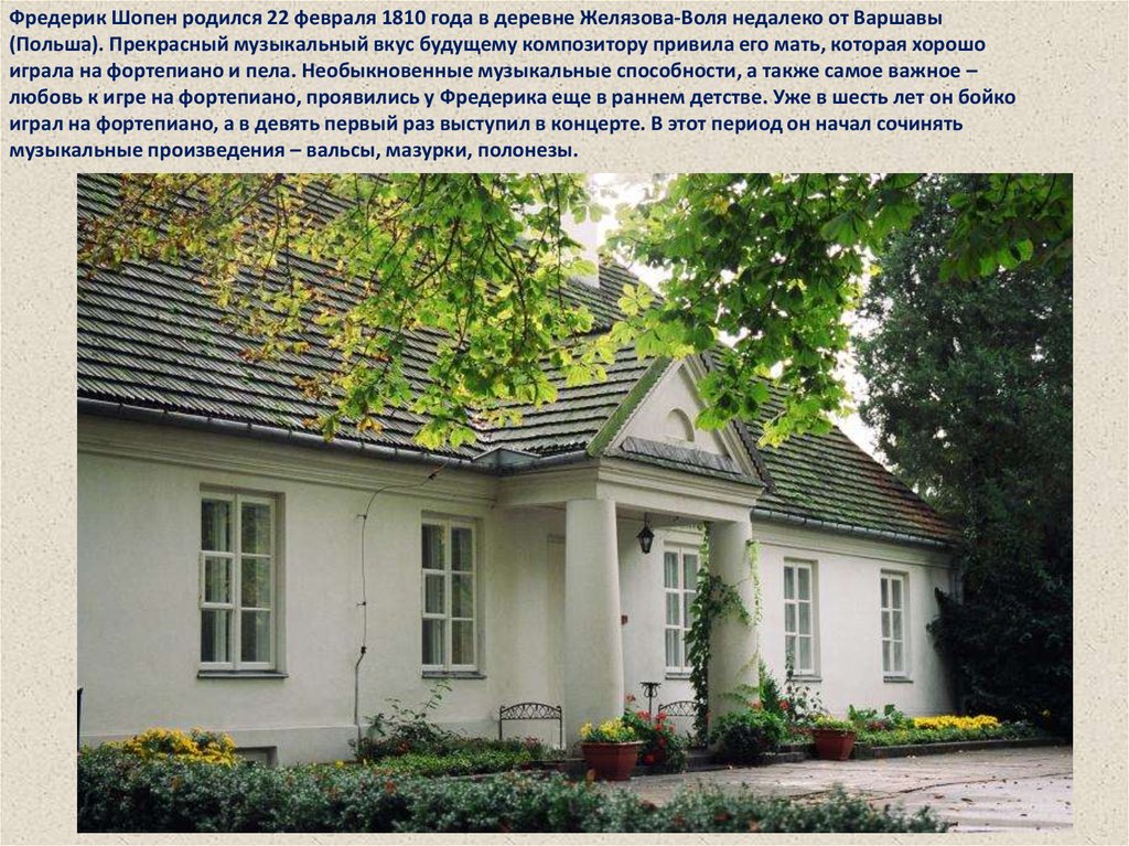 Фредерик Шопен родился 22 февраля 1810 года в деревне Желязова-Воля недалеко от Варшавы(Польша). Прекрасный музыкальный вкус будущему композитору привила его мать, которая хорошо