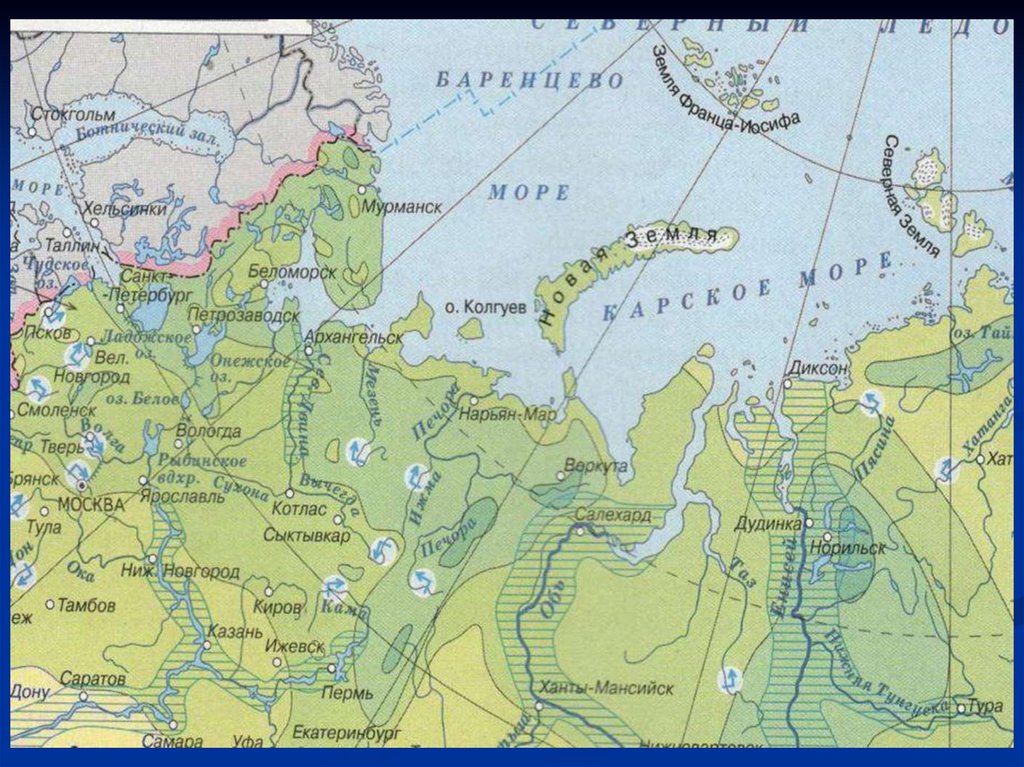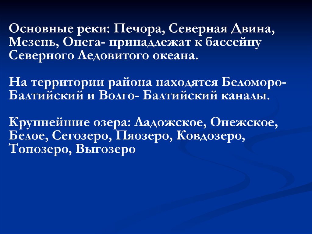 Основные реки: Печора, Северная Двина,Мезень, Онега- принадлежат к бассейну