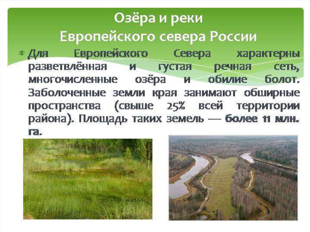 Европейский север богат водными ресурсами, особенноКарелия и Кольский п-ов.(«Озерный край»). Здесь тысячи