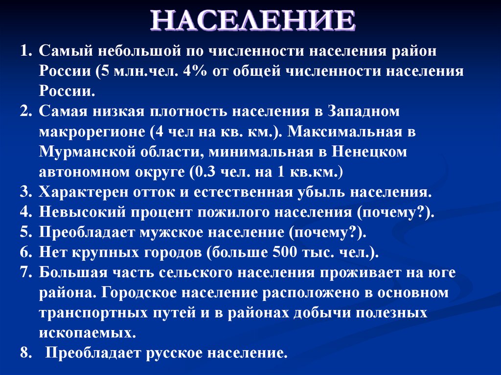 1. Самый небольшой по численности населения районРоссии (5 млн.чел. 4% от общей численности населения