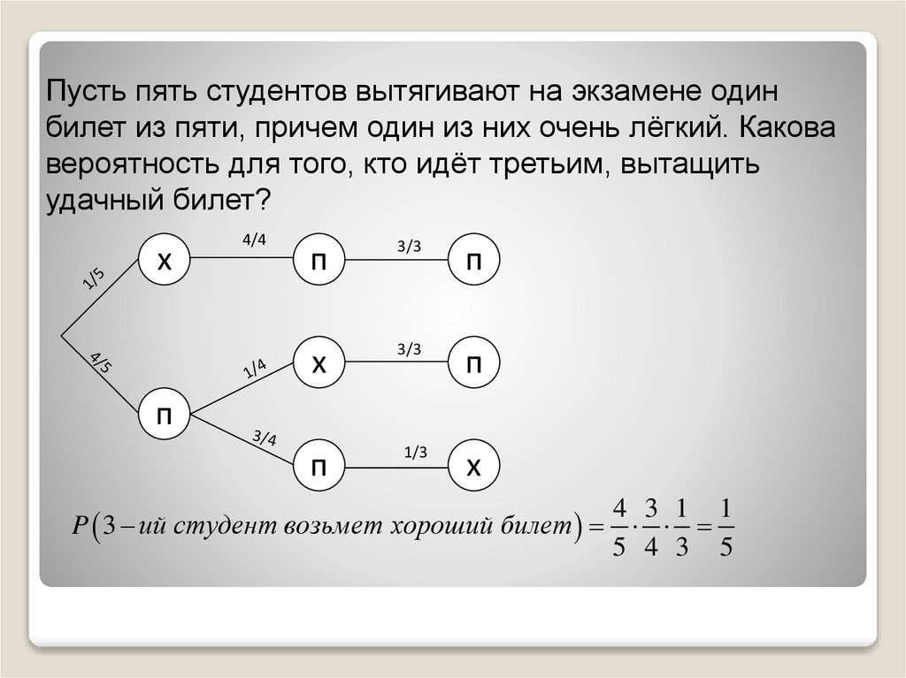 Пусть пять студентов вытягивают на экзамене одинбилет из пяти, причем один из них - очень лёгкий.