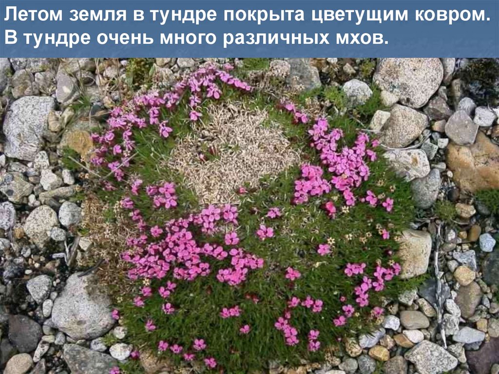 Летом земля в тундре покрыта цветущим ковром.В тундре очень много различных мхов.