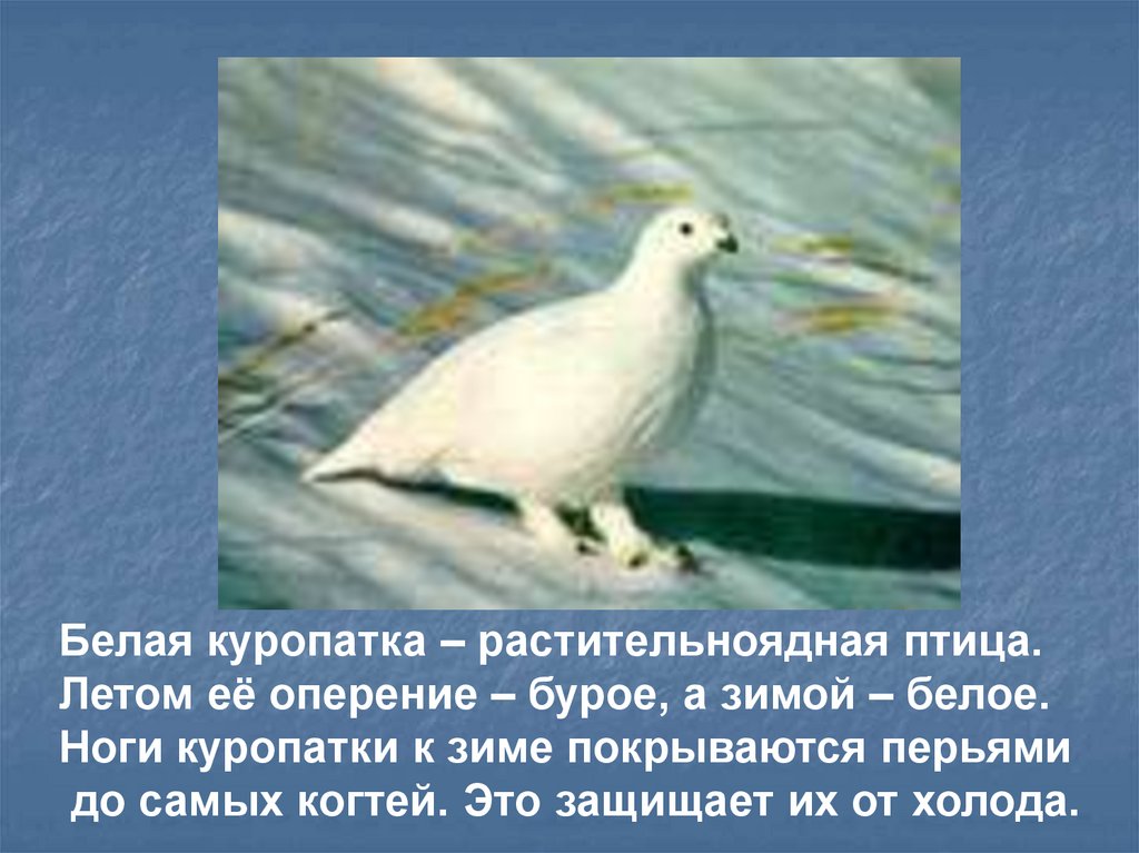 Белая куропатка – растительноядная птица.Летом её оперение – бурое, а зимой – белое.