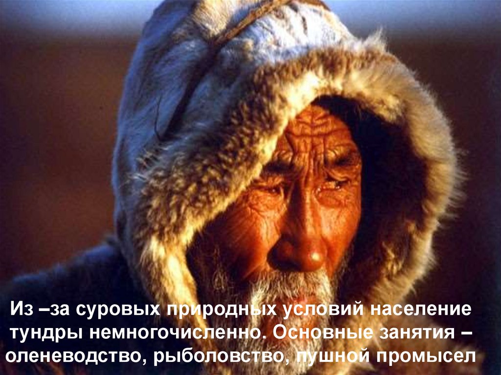 Из –за суровых природных условий населениетундры немногочисленно. Основные занятия –