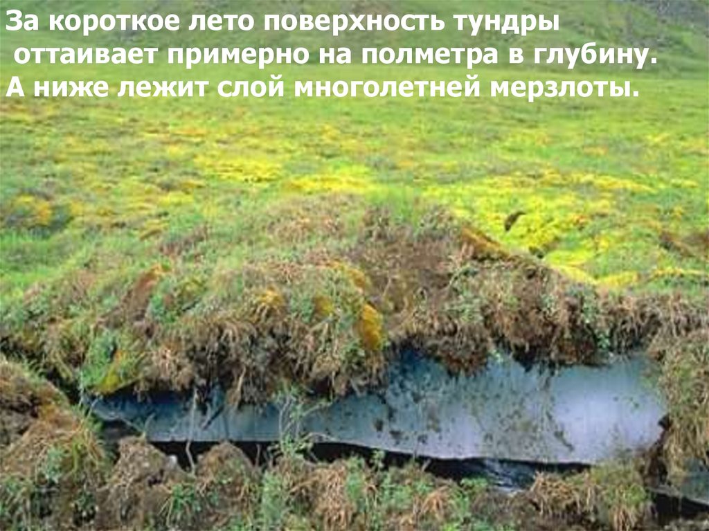 За короткое лето поверхность тундрыоттаивает примерно на полметра в глубину.