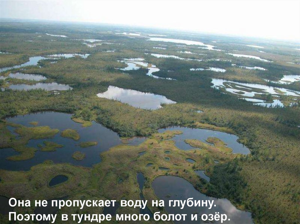 Она не пропускает воду на глубину.Поэтому в тундре много болот и озёр.