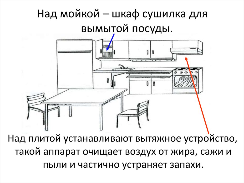 Над мойкой – шкаф сушилка длявымытой посуды.