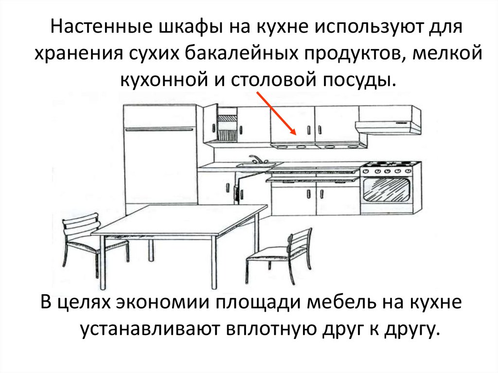 Настенные шкафы на кухне используют дляхранения сухих бакалейных продуктов, мелкой