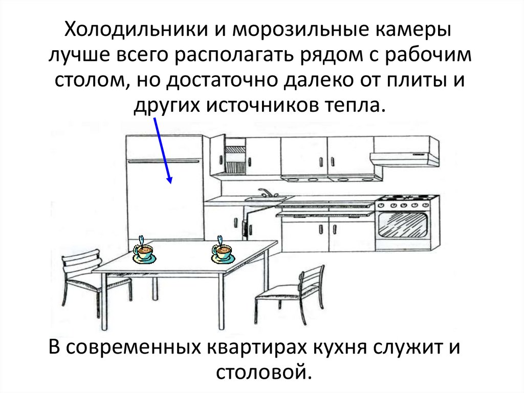 Холодильники и морозильные камерылучше всего располагать рядом с рабочим