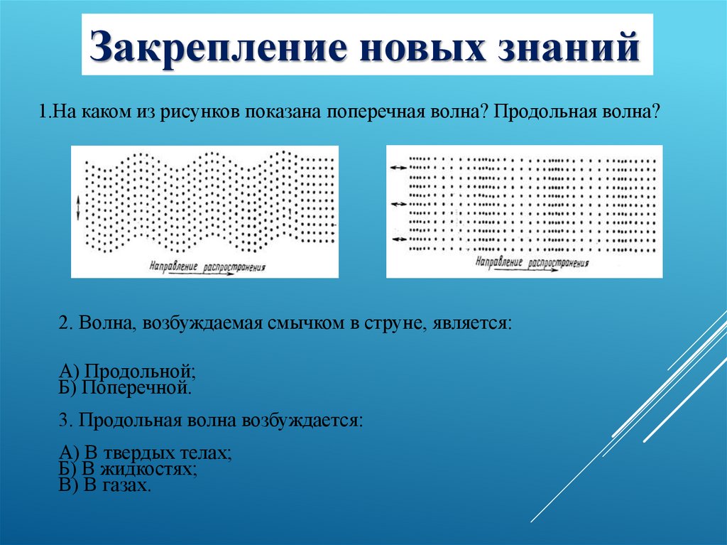 Закрепление новых знаний1.На каком из рисунков показана поперечная волна? Продольная волна?