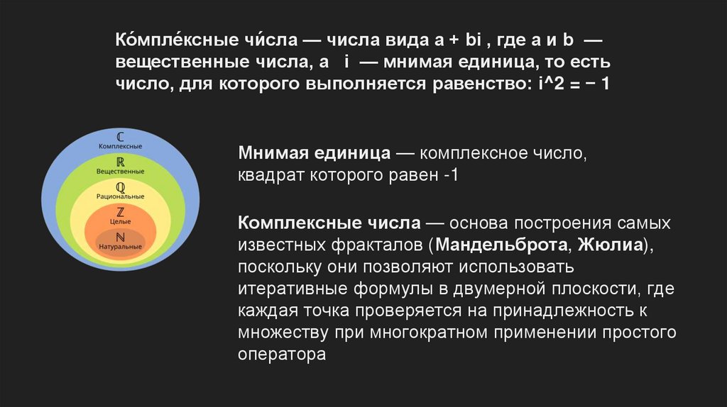 Ко́мпле́ксные чи́сла — числа вида a + bi , где a и b —вещественные числа, а i — мнимая единица, то есть