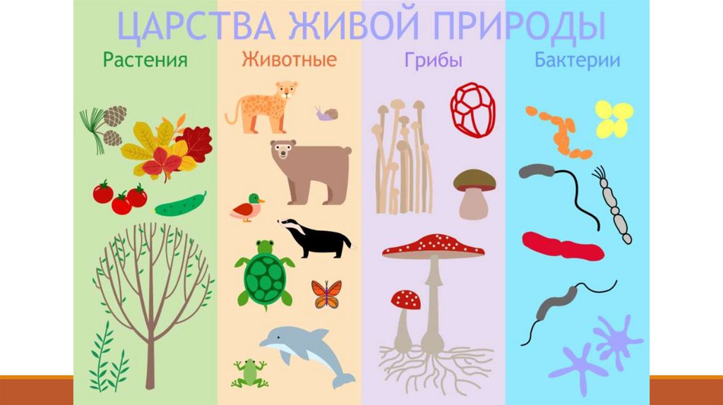 Царство Бактерии: одноклеточные, нет ядра, подвижны.Царство Растения: создают органические вещества,