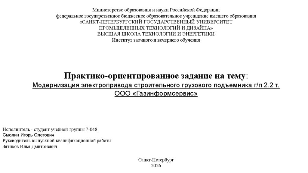 Цель работы – расчет и модернизация электрооборудования строительногоподъёмника, для реализации промышленного процесса за счёт средств автоматизации, получение