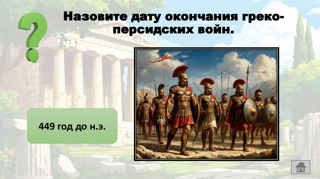 Назовите дату окончания грекоперсидских войн.449 год до н.э.