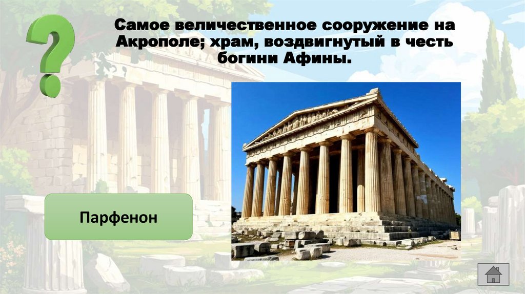 Самое величественное сооружение наАкрополе; храм, воздвигнутый в честь