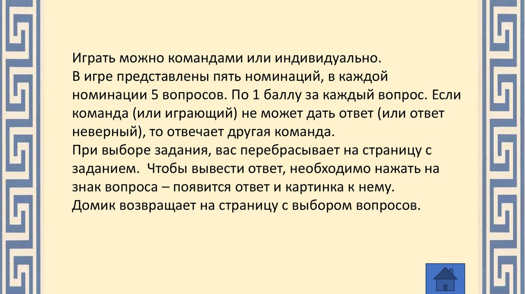 Домик возвращает на страницу с выбором вопросов.