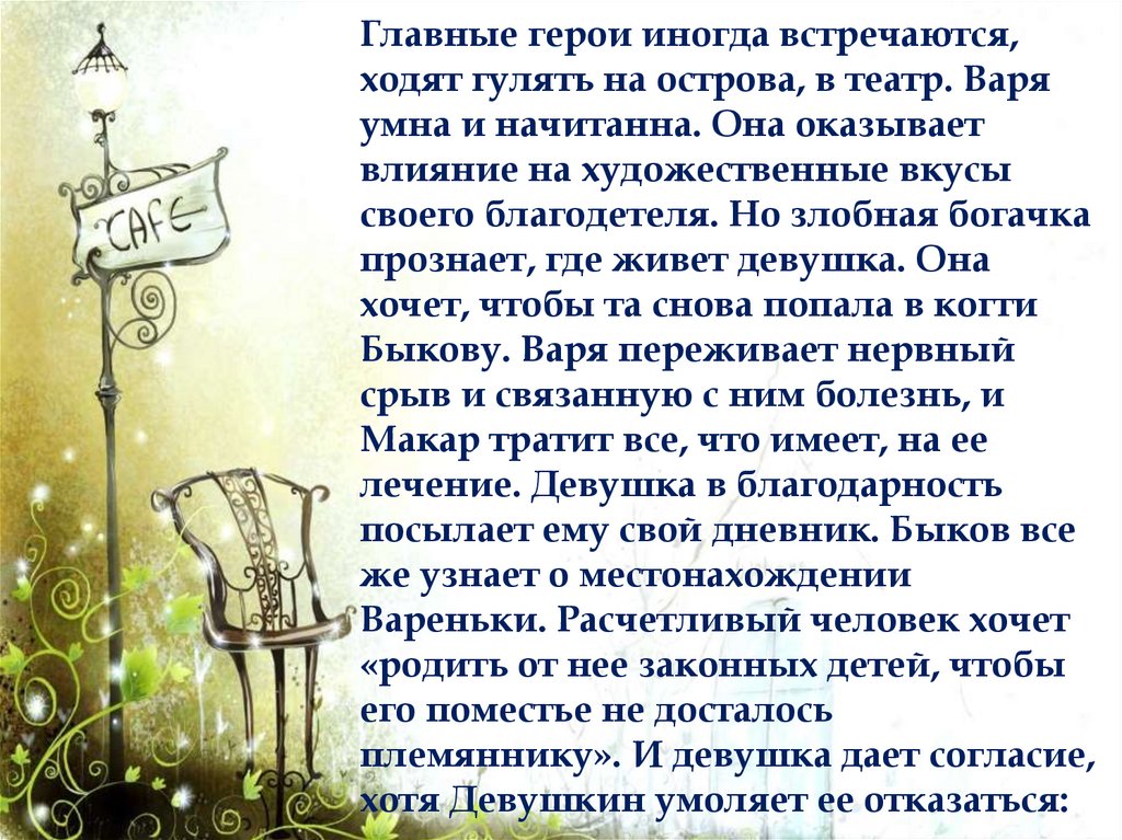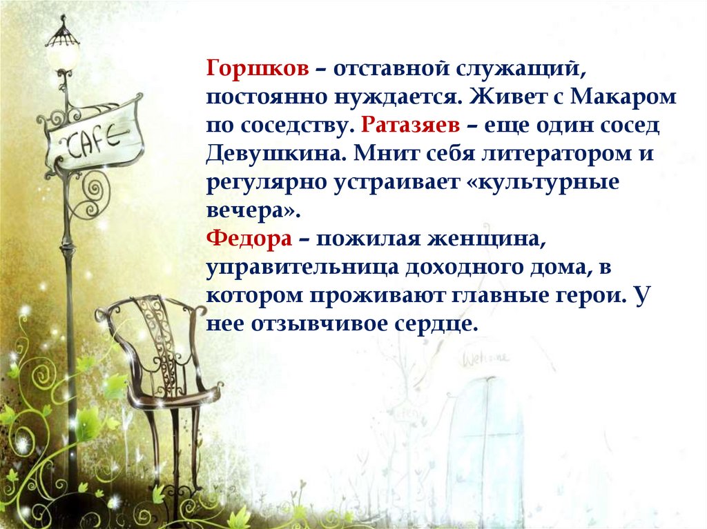 Горшков – отставной служащий,постоянно нуждается. Живет с Макаром