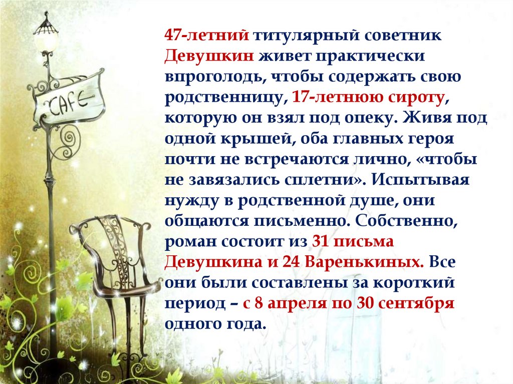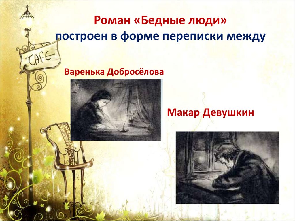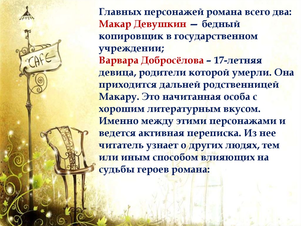 Главных персонажей романа всего два:Макар Девушкин — бедный