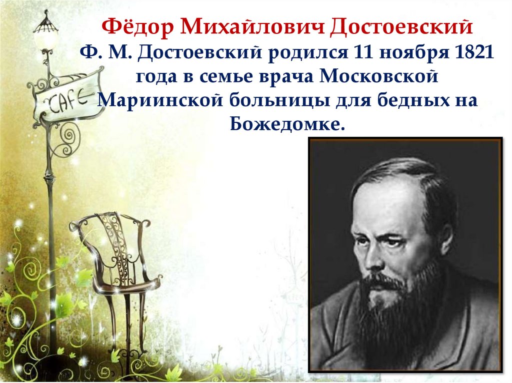 Фёдор Михайлович ДостоевскийФ. М. Достоевский родился 11 ноября 1821