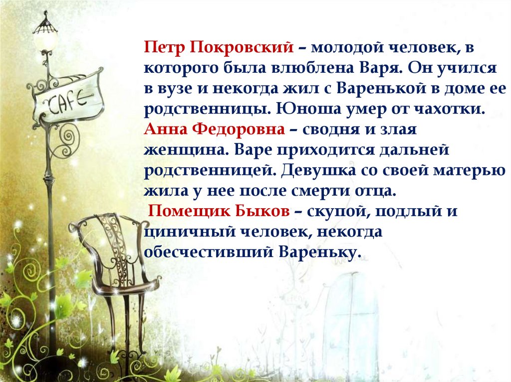 Петр Покровский – молодой человек, вкоторого была влюблена Варя. Он учился
