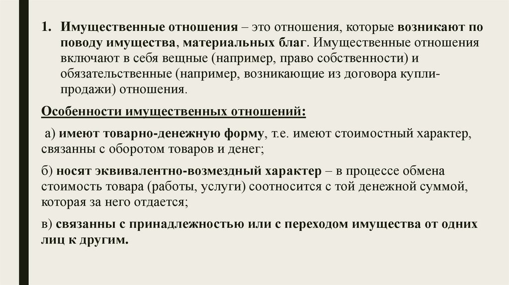 1. имущественные отношения;
