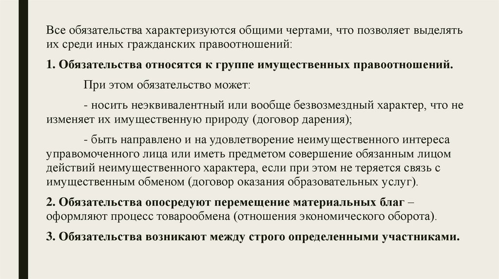Все обязательства характеризуются общими чертами, что позволяет выделятьих среди иных гражданских правоотношений: