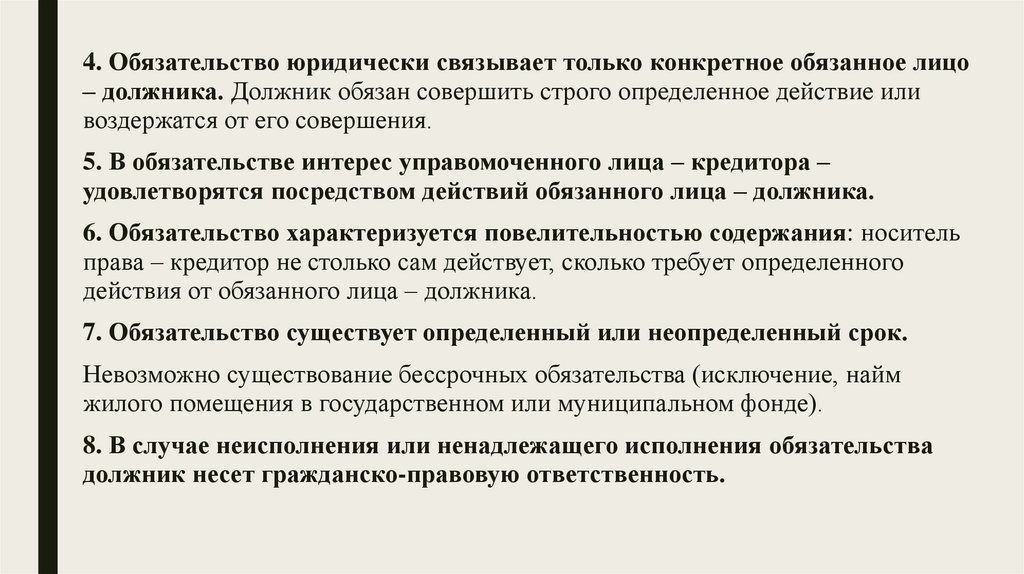 4. Обязательство юридически связывает только конкретное обязанное лицо– должника. Должник обязан совершить строго определенное действие или