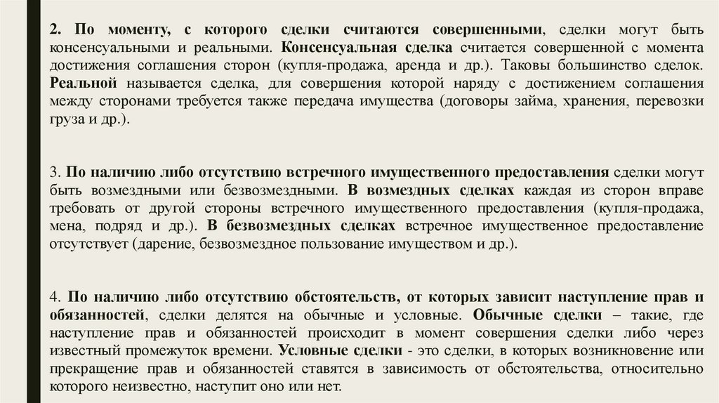 2. По моменту, с которого сделки считаются совершенными, сделки могут бытьконсенсуальными и реальными. Консенсуальная сделка считается совершенной с момента