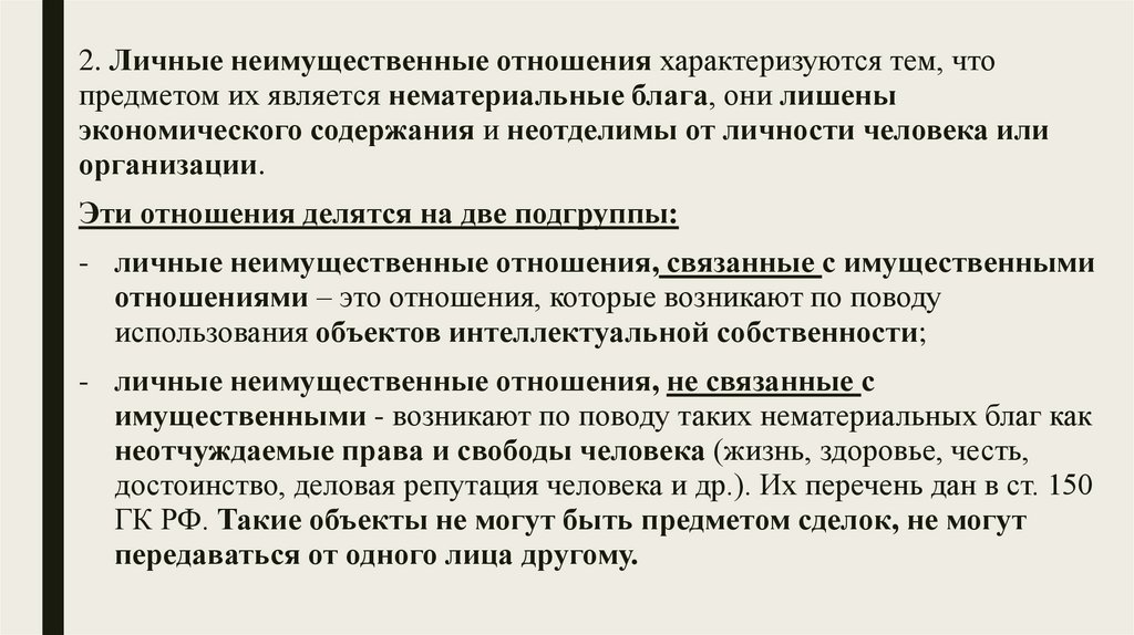 2. Личные неимущественные отношения характеризуются тем, чтопредметом их является нематериальные блага, они лишены