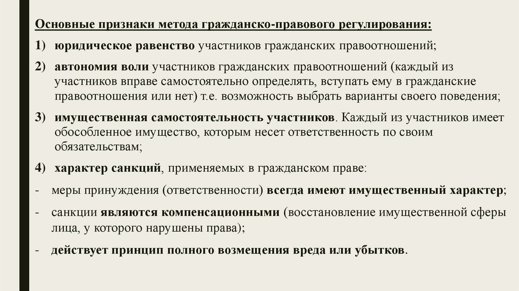 Основные признаки метода гражданско-правового регулирования:1) юридическое равенство участников гражданских правоотношений;