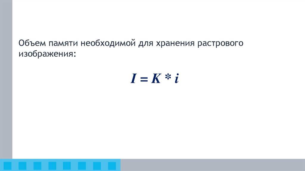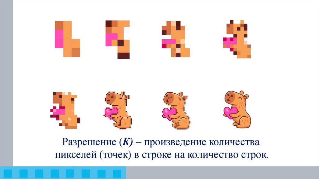 Разрешение (К) – произведение количествапикселей (точек) в строке на количество строк.
