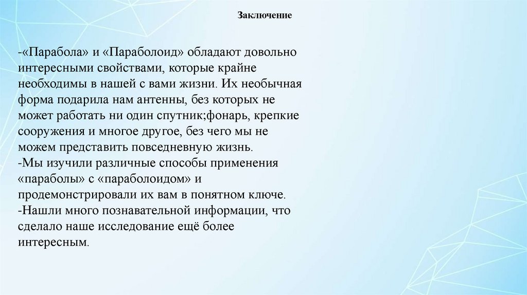 Заключение-«Парабола» и «Параболоид» обладают довольно