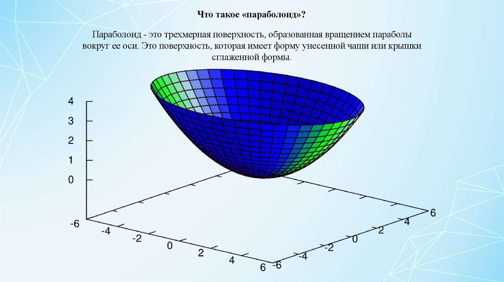 Что такое «параболоид»?Параболоид - это трехмерная поверхность, образованная вращением параболы