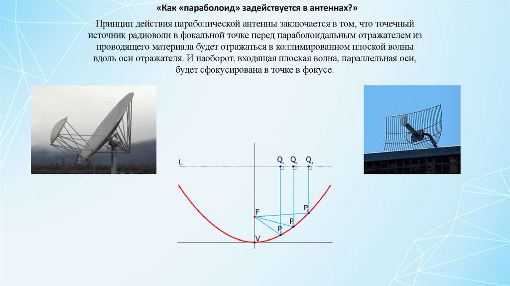 «Как «параболоид» задействуется в антеннах?»Принцип действия параболической антенны заключается в том, что точечный