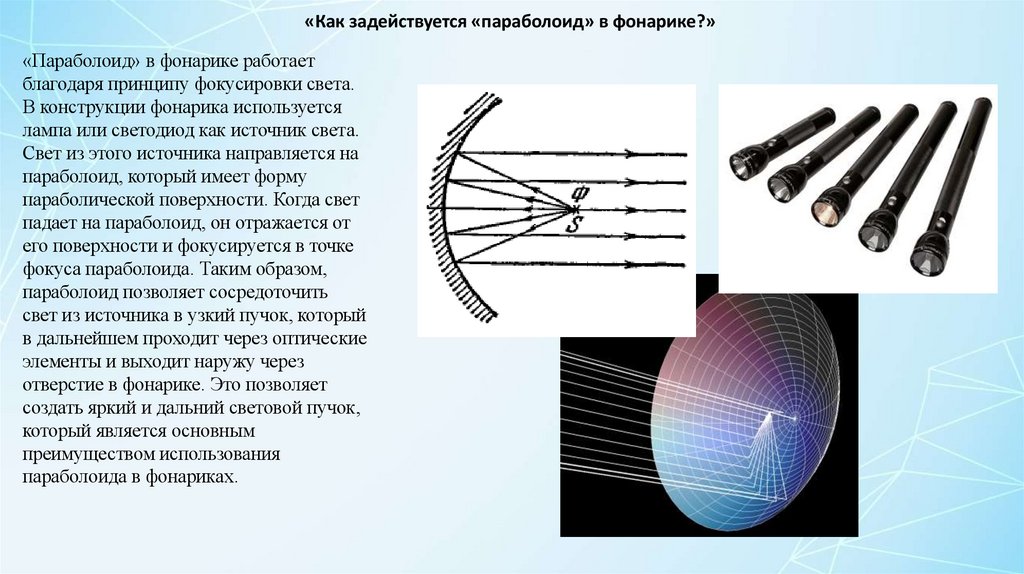 «Как задействуется «параболоид» в фонарике?»«Параболоид» в фонарике работает