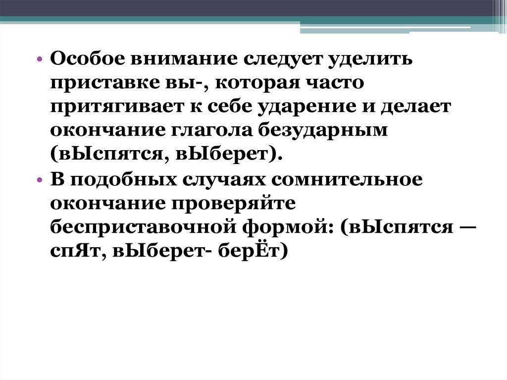 • Особое внимание следует уделитьприставке вы-, которая часто