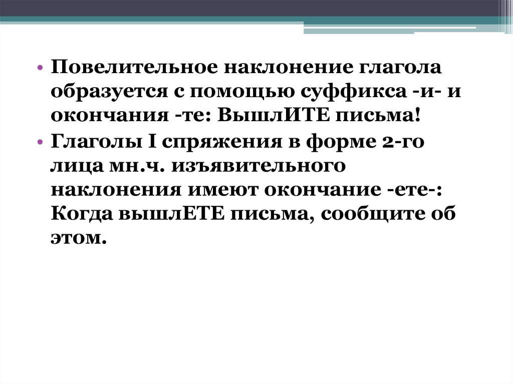 • Повелительное наклонение глаголаобразуется с помощью суффикса -и- и