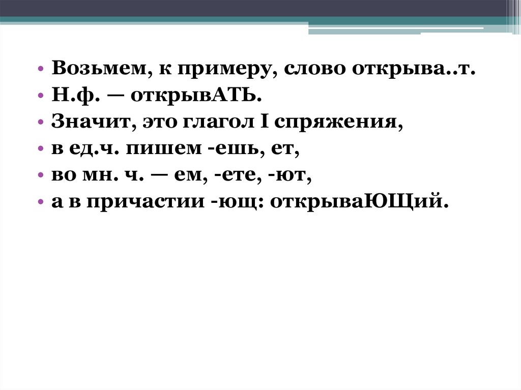• Возьмем, к примеру, слово открыва..т.• Н.ф. — открывАТЬ.