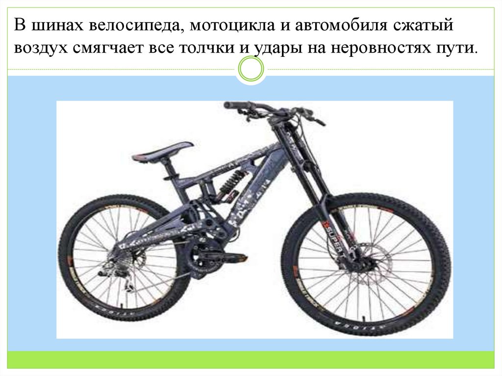 В шинах велосипеда, мотоцикла и автомобиля сжатыйвоздух смягчает все толчки и удары на неровностях пути.