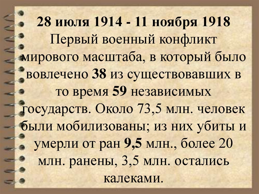 28 июля 1914 - 11 ноября 1918Первый военный конфликт