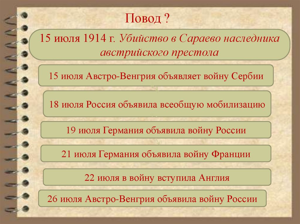 Повод ?15 июля 1914 г. Убийство в Сараево наследника
