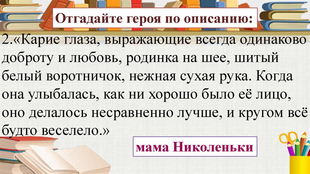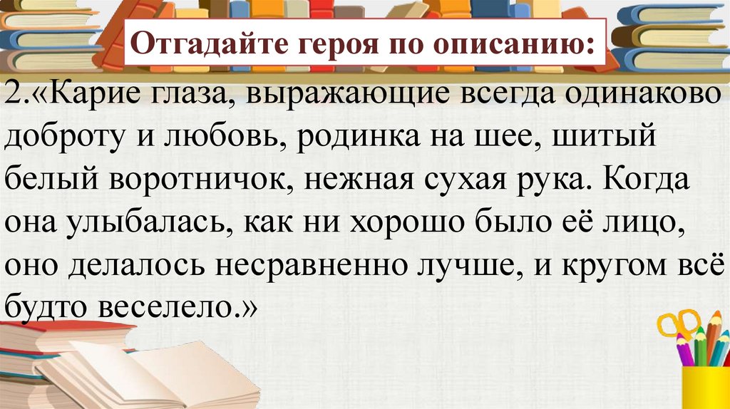 Отгадайте героя по описанию:2.«Карие глаза, выражающие всегда одинаково