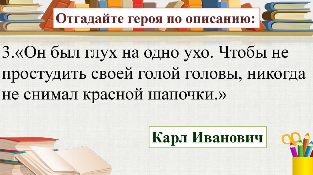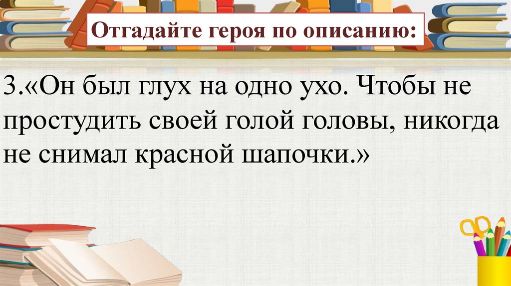 Отгадайте героя по описанию:3.«Он был глух на одно ухо. Чтобы не