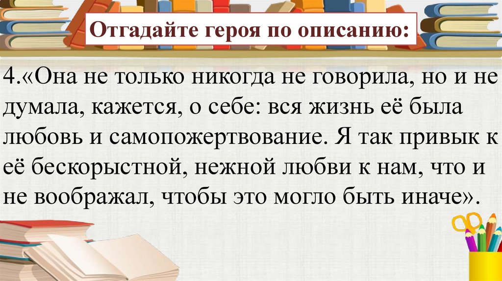 Отгадайте героя по описанию:4.«Она не только никогда не говорила, но и не