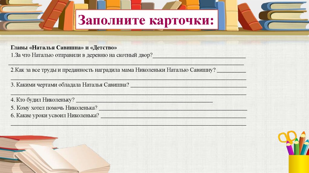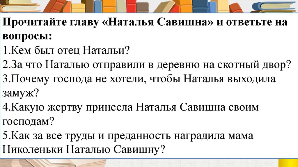 Прочитайте главу «Наталья Савишна» и ответьте навопросы: