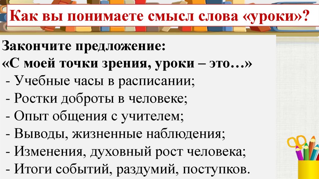 Как вы понимаете смысл слова «уроки»?Закончите предложение: